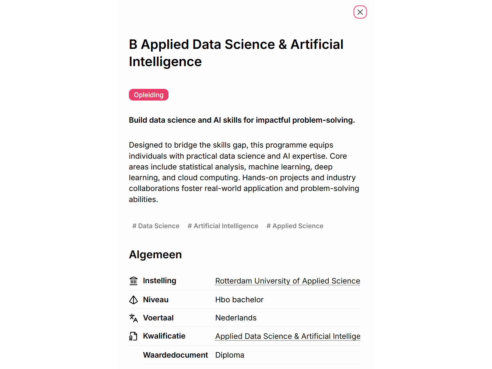 Krijg in één oogopslag alle informatie om een opleiding op waarde te schatten. Zie direct wat een opleiding te bieden heeft, wat de kosten zijn, wanneer het start en waar het wordt gegeven.
